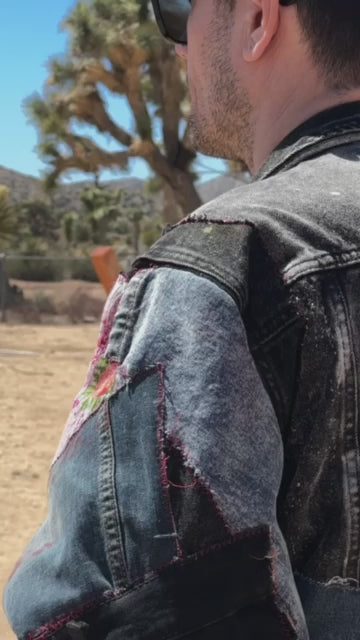 Crafted from black double denim, this classic trucker silhouette is reworked through Buskaveta’s signature techniques: distressing, patchwork, and splatter finishing. A custom floral lining completes the design, adding hidden contrast and artistry inside the jacket.